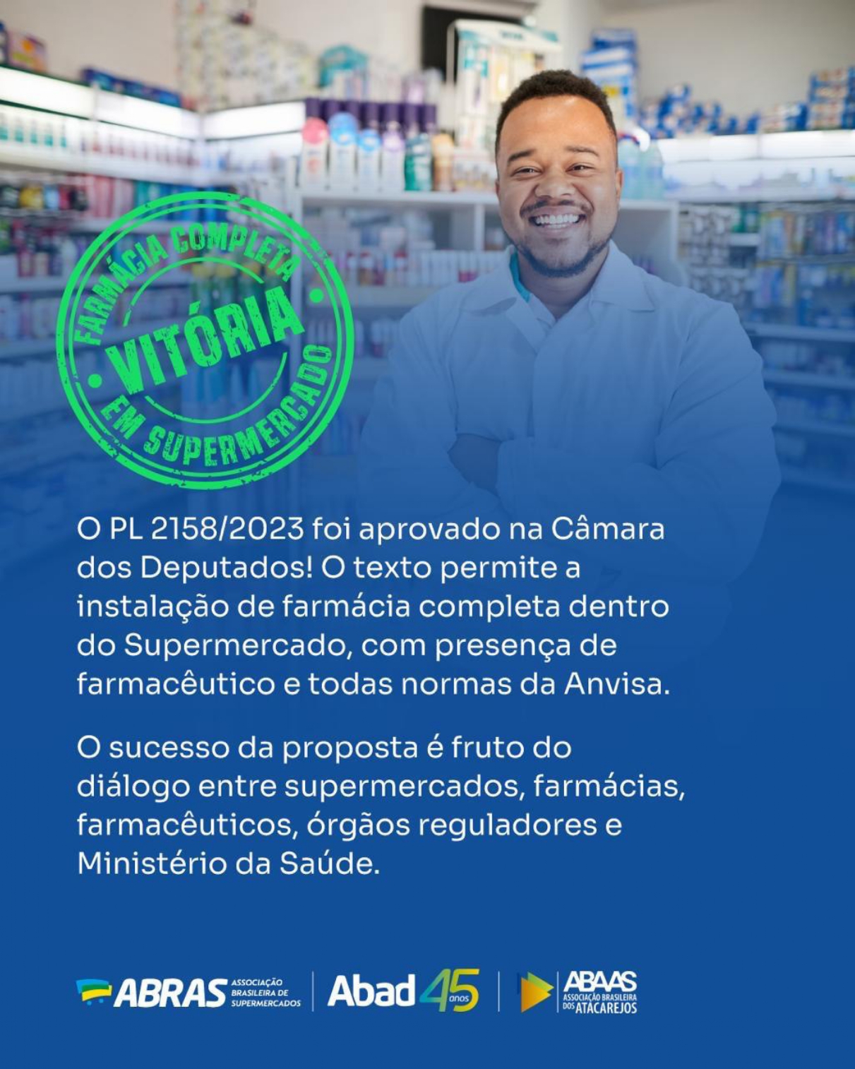 O PL 2158/2023 foi aprovado! O sucesso da proposta é fruto do diálogo entre supermercados, farmácias, farmacêuticos, órgãos reguladores e Ministério da Saúde.